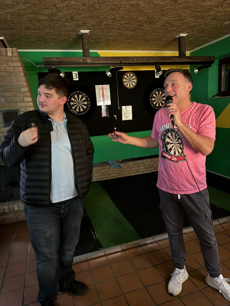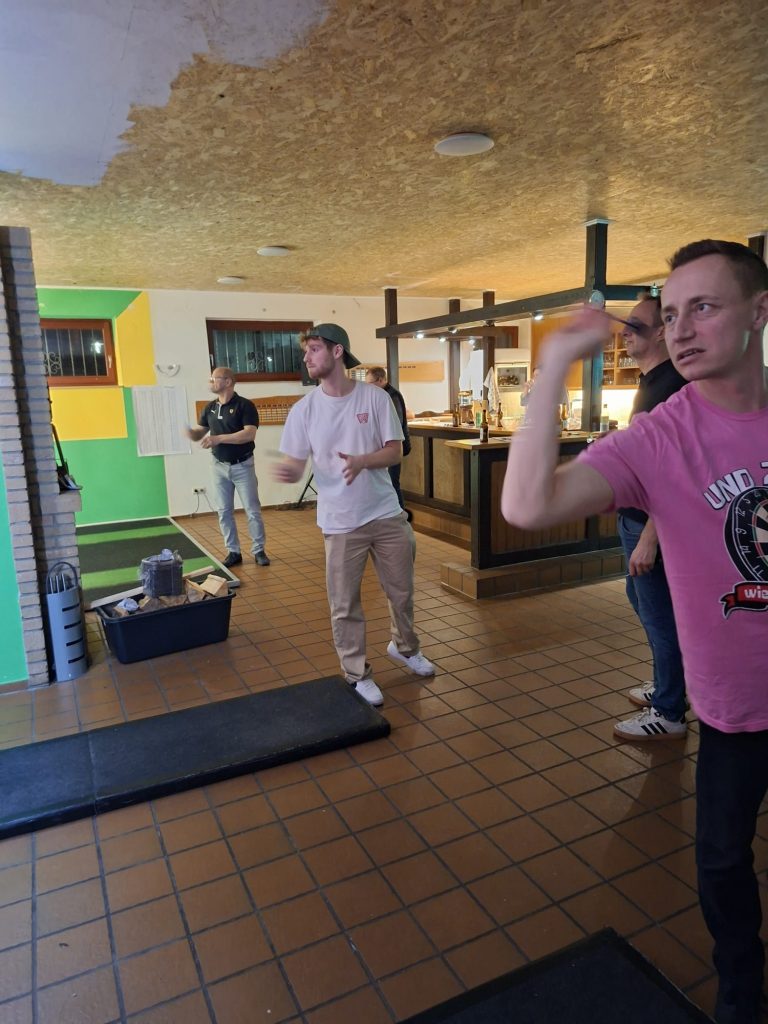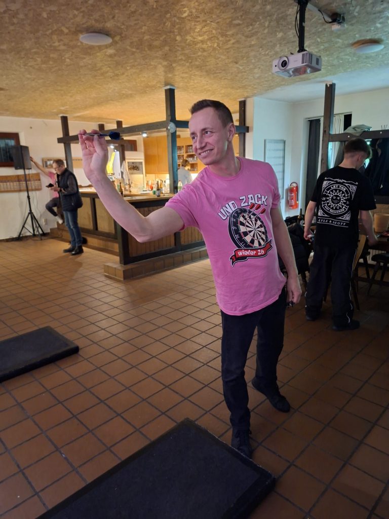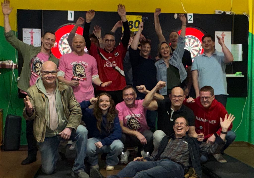 Organisiert wurde der Abend von Marc, Sebastian und Ulf, die sich sichtbar Mühe gegeben hatten – inklusive eigener T‑Shirts mit dem passenden Dart‑Motto: „Und zack – schon wieder 26“.