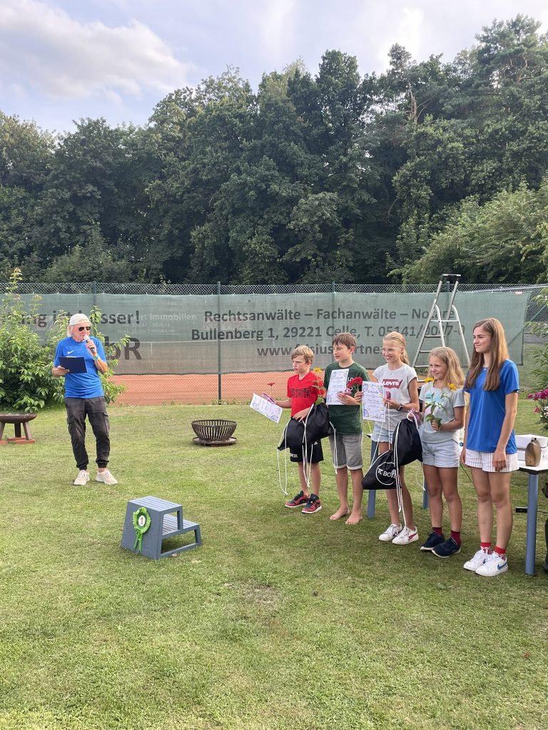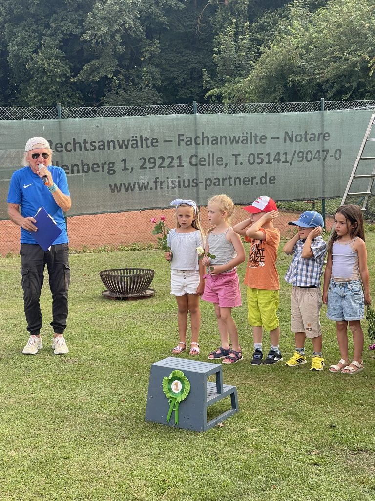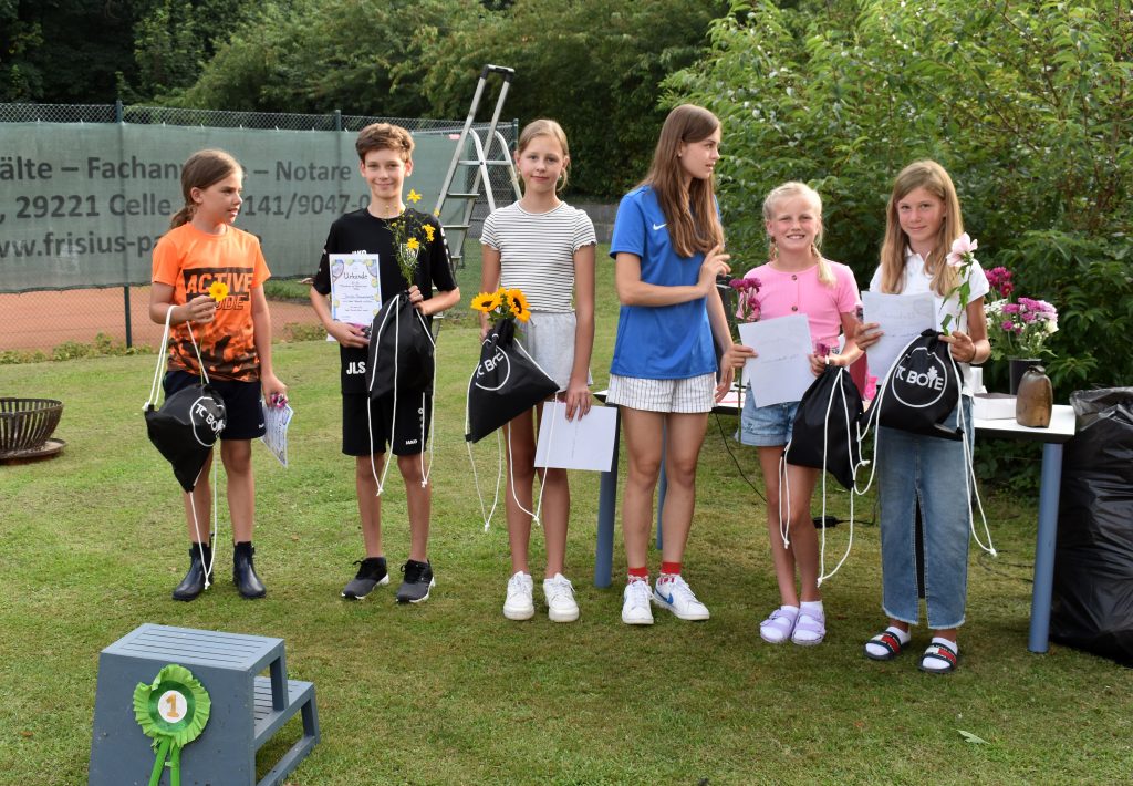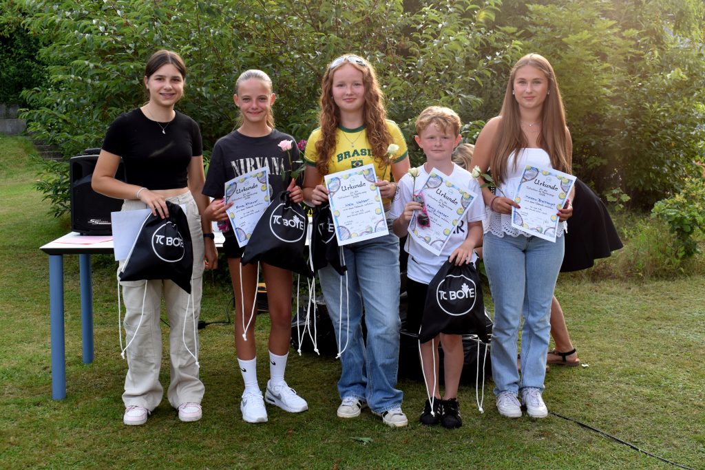 Bei der großen Siegerehrung am Donnerstagabend wurden die selbst benannten Gruppen „Flotte Karotten“, „Sitzsacklay“, „Knall auf Ball“, „Team Alpha“, „Tennispiraten“ und „Los mejores tenistas“ vor den Augen der Familien geehrt.